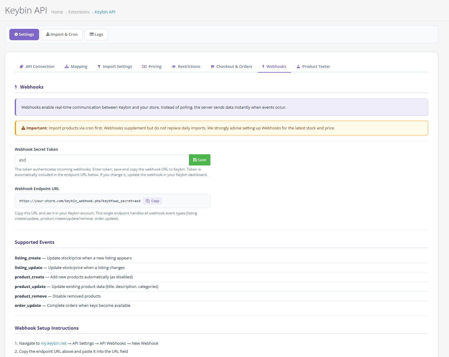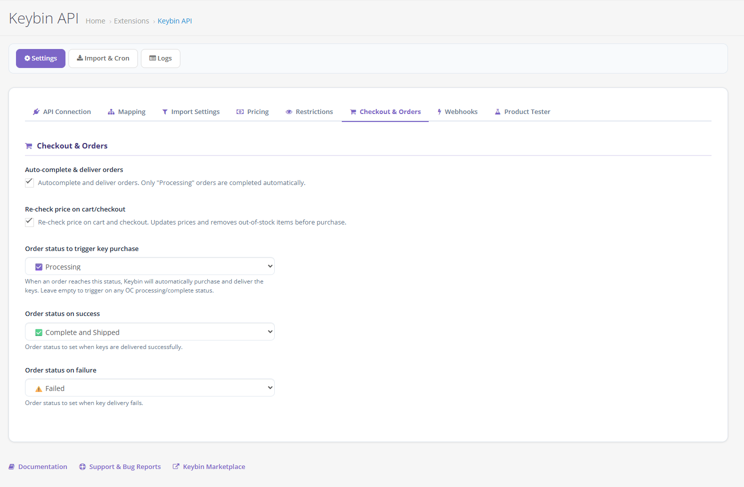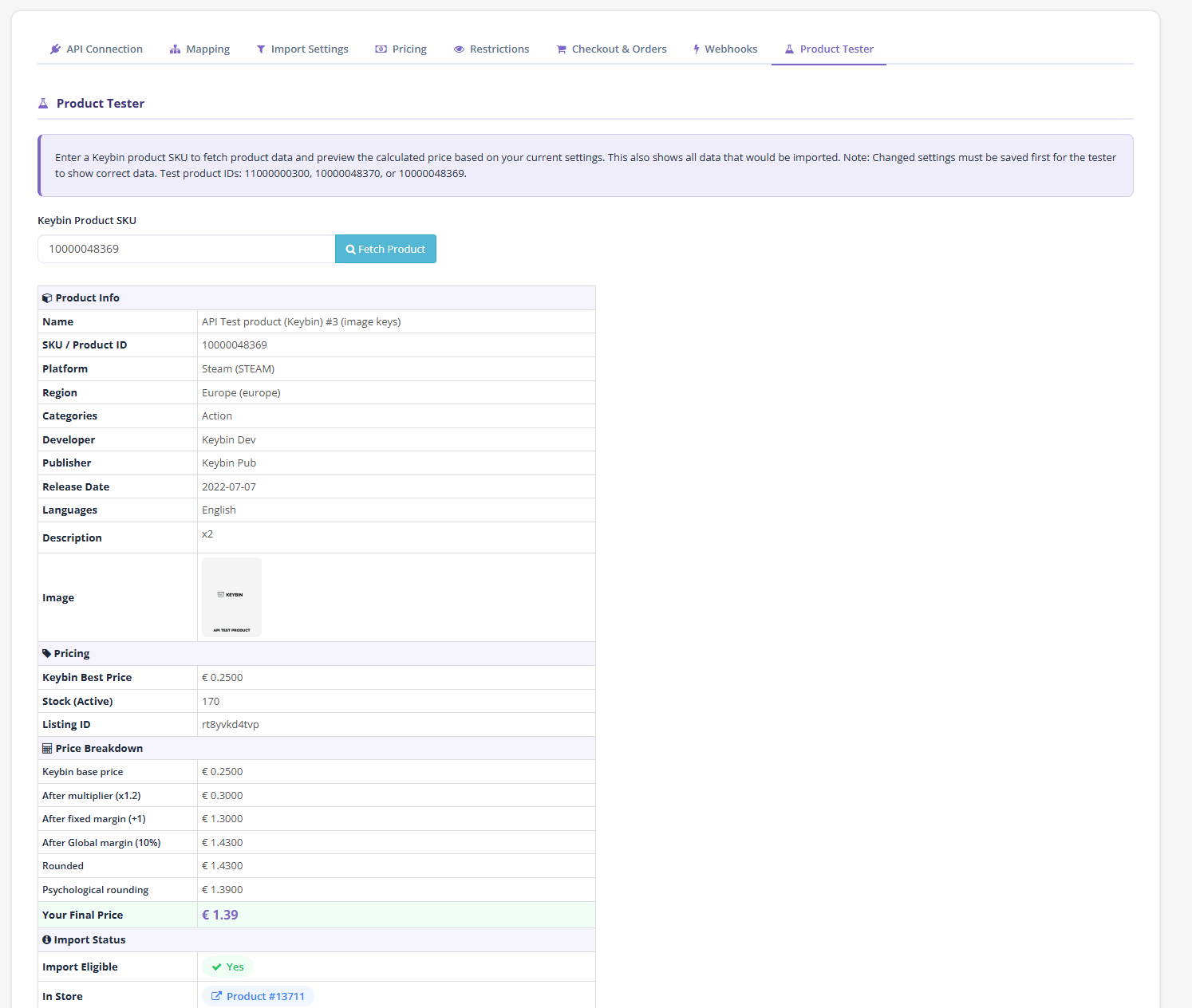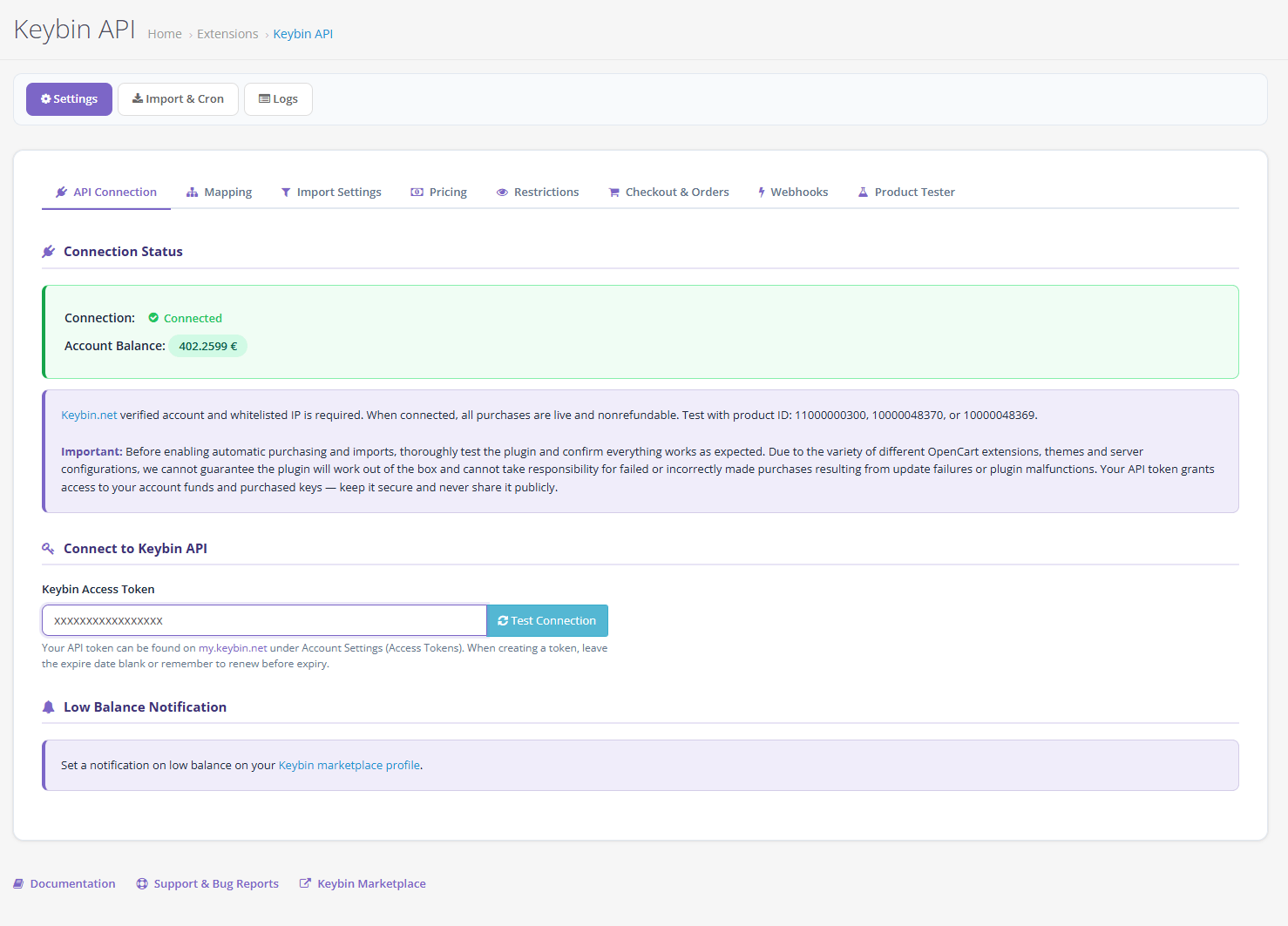 Important: Before enabling automatic purchasing, thoroughly test the plugin with test product IDs and confirm everything works as expected with your store setup. The API token grants access to your account funds—keep it secure.