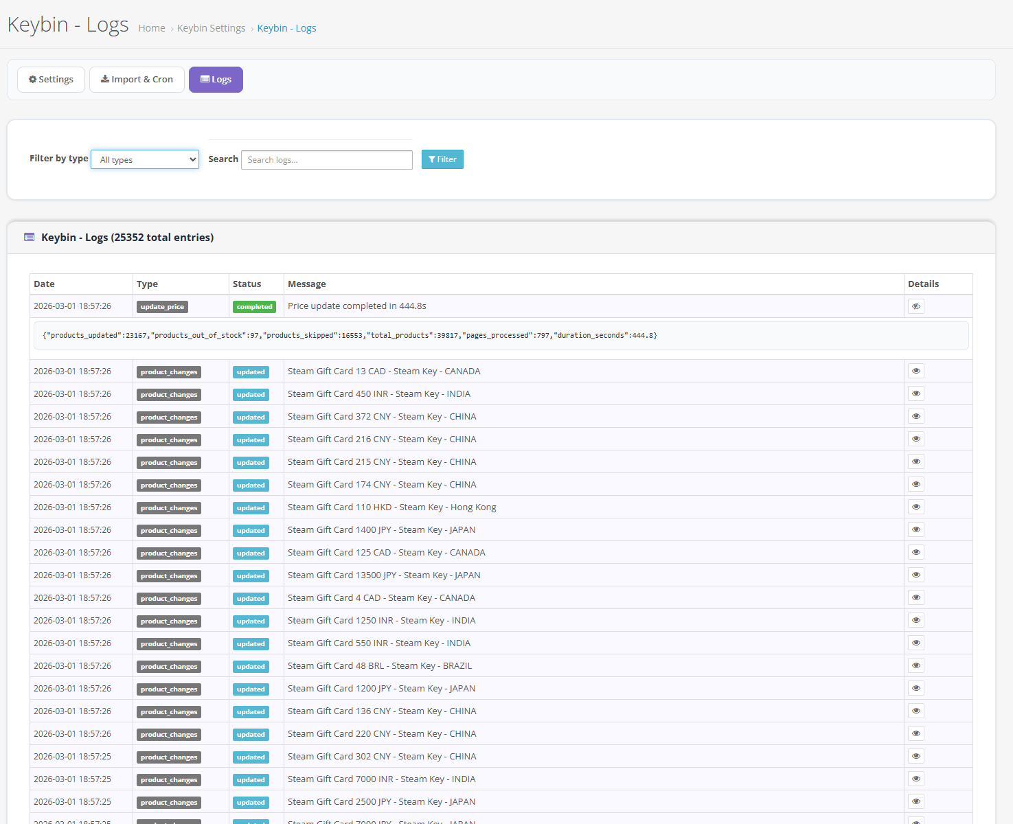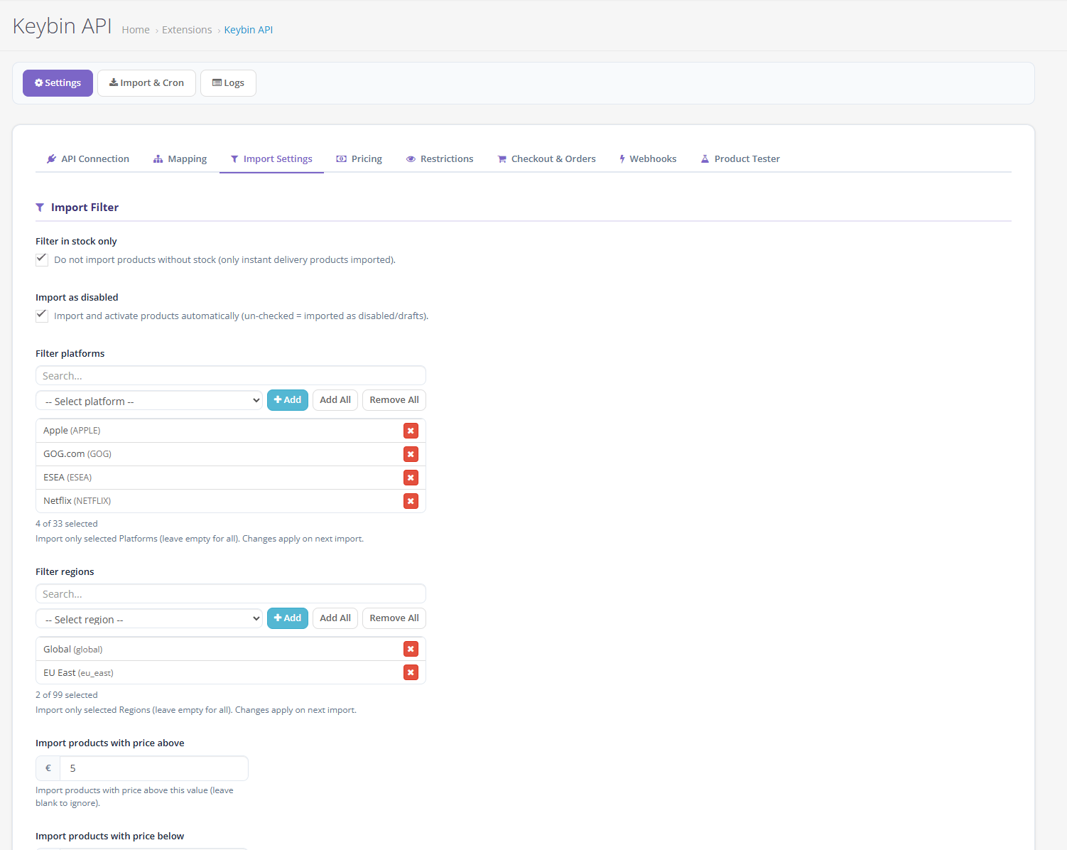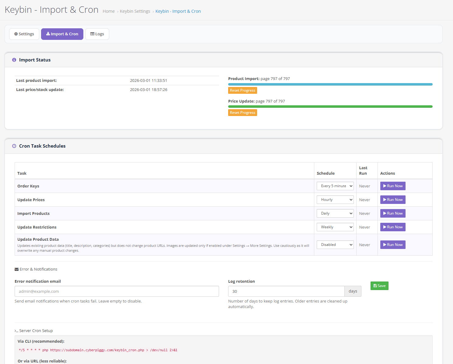 – Cron tasks: import products, update prices & stock, update product data, update restrictions, deliver order keys, log cleanup