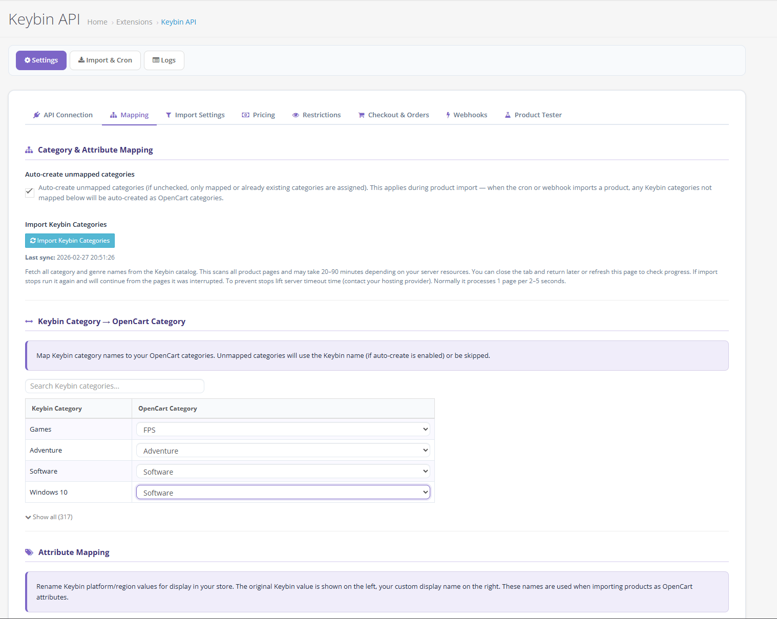 – Product attribute mapping (Platform & Region to OpenCart attributes)